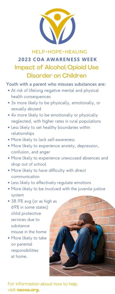To assist in bringing awareness we wanted to share this information on the Impact of Alcohol/Opioid Use Disorder on Children.