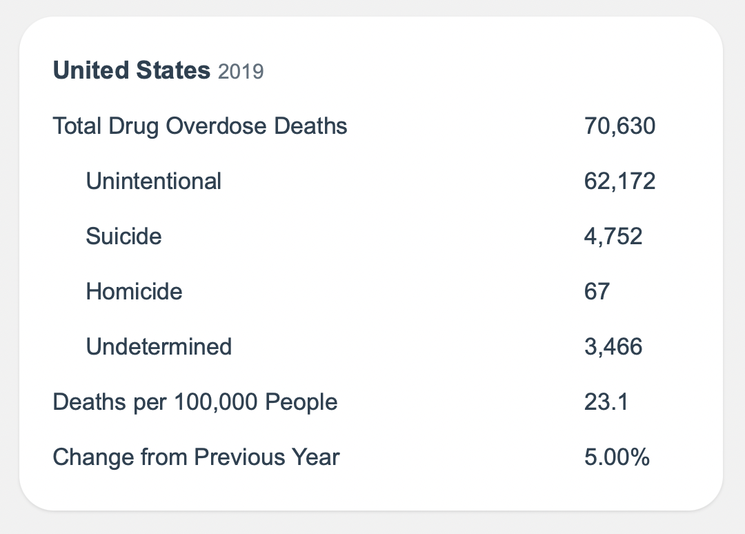 To put this landscape into perspective, 841,000 people have died from a drug overdose since 1999. In 2019 alone, more than 70,000 overdose deaths were reported. These rates are only increasing in most areas, especially regarding opioids and opioid combinations. Other stark figures worth mentioning are that: