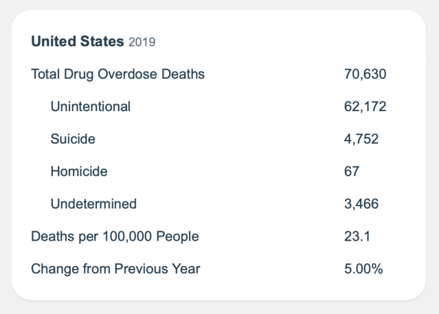 - The total number of overdose deaths is still significantly higher than other preventable causes of death such as HIV/AIDS, car accidents, and gun deaths.